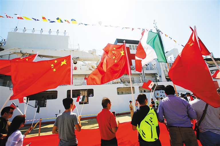 11月12日,在墨西哥阿卡普尔科港,当地华侨华人欢迎中国海军和平方舟医院船抵达。 当地时间11月12日,执行“和谐使命—2015”任务的中国海军和平方舟医院船抵达阿卡普尔科港,开始对墨西哥进行为期7天的友好访问,并提供医疗和人道主义服务。 新华社发