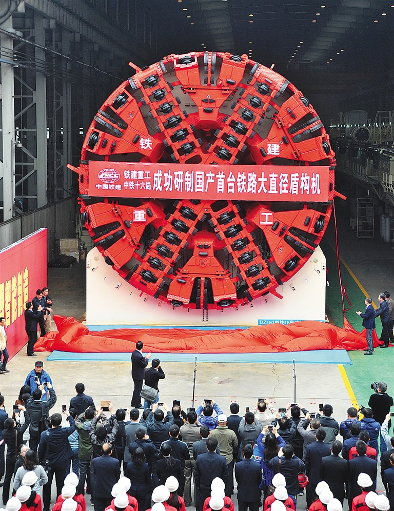 11月14日,国产首台铁路大直径盾构机在湖南长沙顺利下线。该装备由中国铁建重工集团和中铁十六局集团合作研发,拥有完全自主知识产权,它的成功下线填补了我国铁路大直径盾构机自主品牌的空白,标志着国产大直径掘进装备关键技术研究与应用又取得了一个新的突破。据介绍,该设备开挖直径8.8米,总长100米,每台售价比进口盾构机便宜2000万元以上。新华社记者 龙弘涛 摄