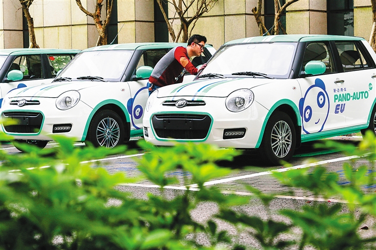 11月14日,一名顾客在重庆市一新能源汽车分时租赁站点了解新能源汽车。 从11月11日起,重庆首批分时租赁的300辆力帆纯电动汽车投入使用。该批新能源汽车时租价格为19元/小时,日租价格为99元/天,每一次换电可持续行驶250公里。重庆计划今后继续加大新能源汽车分时租赁站点布局建设,方便人们使用。 新华社发