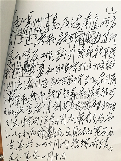在12月18日的毛泽东用毛笔书写的电报中,记者发现,毛泽东明确地提出“渡海作战与我军所有作战的经验不相同,部队必须注意潮水和风向,必须集中一次运载至少一个军四五万人的全部兵力,携带三天以上的粮食,建立稳固的滩头阵地,随即独立攻进而不要依靠外援”。