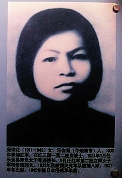 1931年3月26日,全琼工农兵第三次代表大会在乐会、万宁两县交界的加荣村举行闭幕式。在闭幕式上,乐会县赤色女子军连宣告成立。赤色女子军连仅有一个排的人数,连长便是庞琼花,指导员是王玉文。