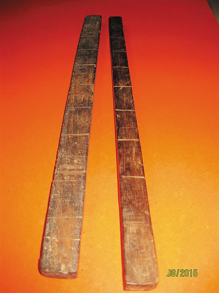 聚居在我国海南岛五指山区的黎族同胞,使用刻木记事的历史相当悠久。据史籍《隋书·地理志下》记载:岭南二十余郡俚人,“刻木以为符契,言誓则至死不改”。宋代苏东坡子苏过在其《斜川集·论海南黎事书》中则明确记有:黎人“无文书符契之用,刻木结绳而已”。清《崖州志》卷十三载,“黎人赊借,刻竹为契,刳两执之。”关于黎族结绳尚未发现见更详细的记述,但刻木为契的记事情形则多有所见。 黎族刻木契约的原材料多是木片或竹片,竹契的长度一般根据交易物品的价值高低而定。价值小者用短竹,价值大者用长竹,短者则如手指般的长度。“黎人贸易称贷,截竹约一指长,每千钱刻一痕,剥开各执一”,由此可见,黎族刻木文化,具有历史渊源可以考据。