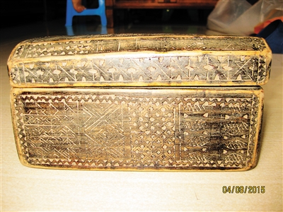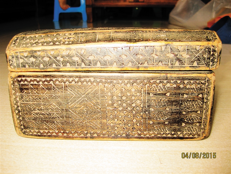 随着时间的推移,黎族刻木记事习俗至明清时期逐渐淡化,而能够在黎族民间承载这一“文字”功能的刻画记忆却同时在黎族民间风行起来,即在纺织用具、木盒、藤篮垫圈上雕刻有内容丰富的图案。在海南省东方市黎族聚居地,有一种刻画技艺精湛、图案丰美的纺织木棒和木盒,是黎族妇女传统使用的踞腰织机构件木棒和装存针线的刻画木盒,俗称为“记忆棒”和“刻画盒”,记忆棒和木盒上刻绘有与黎锦传统图案相同的人形纹、几何纹、植物纹等。