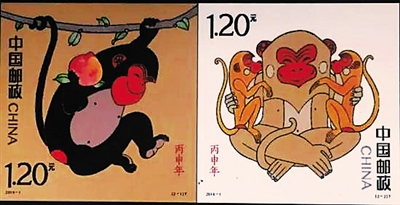 2016年的猴票共两枚,第一枚画面是一只猴子手捧仙桃挂于桃枝之上,取意“捧桃献瑞”;第二枚画面是一只母猴怀抱二子,意为“合家欢乐”。据悉,在猴票第二幅图的设计上,曾有人建议画一只大猴抱着一只小猴,黄永玉先生则表示,现在政府已经放开第二胎了,我们可以画两只。黄永玉与时俱进的创意,获得大家一致点赞。于是,两只小猴亲吻母亲,母亲搂抱两只小猴的温馨画面,如今就出现在丙申年特种邮票上。