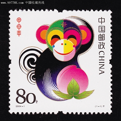 第三轮生肖邮票恢复单枚一套,2004甲申年猴票图案是一只手捧寿桃的花脸黑猴,全身色彩绚丽,很有冲击力,具有强烈的现代艺术之美,与中国春节的喜庆气氛吻合,寓意在新春到来之际祝福人们吉祥如意,健康长寿,此套邮票在第二年被评为“2004年最佳设计邮票”。这套邮票的独特之处,还在于其外形为边长36毫米乘以36毫米的正方形邮票,这是新中国成立以来发行的第一套正方形生肖票,票面大,贴于信封上十分抢眼,因而获得了集邮爱好者和新年寄贺信人的普遍喜爱。该枚邮票面值0.80元,现市值达到15元,从升值的角度看,这枚邮票的设计也是被人们认可的。