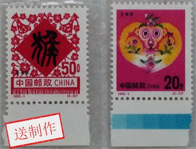 第二轮生肖邮票首当其冲的当然仍是猴。1992壬申年(猴票)为两枚,一枚为猴桃瑞寿,一枚为喜鹊登梅,第一轮生肖邮票因为是在初创阶段,因此风格各异,给收藏者带来许些遗憾。第二轮生肖邮票规定了严格的设计原则,一是一套两枚,二是图案与书法并重,在全套邮票中各占一枚,第一枚为生肖图案,第二枚为不同书体的生肖文字。殊不知,风格虽然得到了统一,但生肖图案与书法艺术实在没有联系在一起的必要,反而削弱了生肖主题,图与文在艺术表现力上也难于达到协调一致,因此普遍不受集邮收藏者欢迎。壬申年猴票第一枚仅以一个猴的脑袋镶嵌于一个桃形中,没有美感与灵动,第二枚喜鹊登梅的红色剪纸衬托一个黑色的猴字,美观与吉祥也不足,此套邮票面值0.70元,发行至今已有23年,但市场价值仅3元多,而且很难售出。