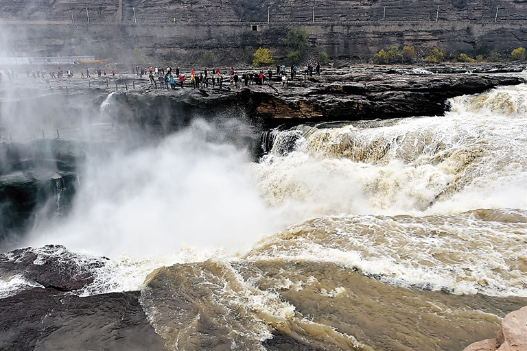 11月16日,游客在黄河壶口瀑布景区观赏瀑布。 近日,受上游持续降雨天气影响,位于山西省吉县和陕西省宜川县交界的黄河壶口瀑布水量激增,瀑布瀑面骤然变宽,形成特大瀑布群。奔腾咆哮的黄河水翻滚而下,气势磅礴,甚为壮观。 新华社记者 詹彦 摄