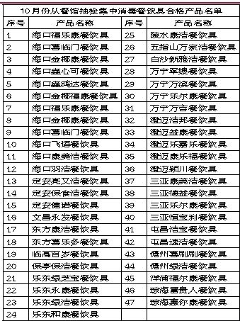 海南省食品药品监督管理局公告(2015年第11号)关于公布10月份集中消毒餐饮具抽检合格名单的公告