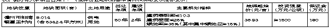 二、申请人资格:(一)中华人民共和国境内外的法人、自然人或其他组织均可报名参加竞买(除法律、法规另有规定的除外),申请参加竞买者须提出书面竞买申请,并提供《竞买须知》中要求提供的相关文件。本次挂牌不接受联合体竞买。(二)具有下列行为之一的,不得参加本次土地挂牌竞买:1、在儋州市范围内有拖欠土地出让金行为,至今尚未付清的;2、在儋州市有闲置土地、违法利用农村集体土地建设商品住房、擅自改变土地用途等违法行为,并未及时纠正的。(三)、竞买人具备申请条件并按规定缴纳足额竞买保证金的,在规定的时间内确认其竞买资格,签发挂牌资格确认书。三、本次国有建设用地使用权以现状挂牌出让,按照“价高者得”的原则确定竞得人。四、申请人可于2015年11月18日至2015年12月16日到儋州市国土环境资源局或海南省政务服务中心二楼省公共资源交易中心22号窗口查询和获取挂牌出让文件。五、申请人可于2015年11月18日至2015年12月16日到儋州市国土环境资源局或海南省政务服务中心二楼省公共资源交易中心22号窗口提交书面申请。交纳竞买保证金的截止时间为2015年12月16日下午17时(以保证金实际到账为准)。经审查,申请人按规定交纳竞买保证金,具备申请条件的,我局将在2015年12月16日下午17时前确认其竞买资格。六、本次国有土地使用权挂牌活动在海南省政府会展楼二楼省公共资源交易服务中心土地交易厅进行。地块挂牌时间为:2015年12月7日上午8:30至2015年12月21日上午11:00。七、其他需要公告的事项:1、本次挂牌出让不接受竞买人电话、邮寄、电子邮件及口头等方式申请及报价,不接受联合竞买。2、受理报名、报价时间:上午8:30至11:30,下午14:30至17:00,节假日除外。3、本次挂牌出让事项如有变更,届时以变更为准。八、联系方式:联系地址:儋州市中兴大道儋州市国土环境资源局;联系电话: 0898-23883393 65303602。联系人:郭先生 查询网址:http://www.ggzy.hi.gov.cn www.landchina.com