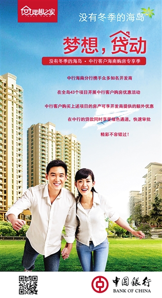 据悉,中国银行海南省分行为满足客户在海南购置房产的需求,倾心打造了“没有冬季的海岛”购房专享活动。目前,该行已与万科、恒大、绿地、华润、雅居乐、碧桂园、新世界、新城、广物、观澜湖等知名开发商在全省范围内开展中行客户购房优惠活动,涉及43个楼盘项目,覆盖全岛。