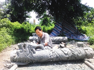 记者见到王科美是在美兰区沙塘村里的一处仿古庙宇的建筑工地上,他如今带着从事石雕、木雕工艺工程队在海南干起了古建筑修建的营生。这个工地,已经是他的工程队近年来接到的第五个工程。