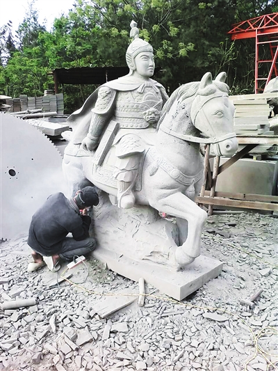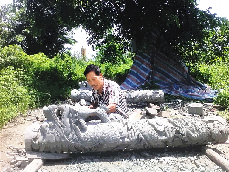 在龙塘镇通往海文高速的一条柏油路边,各种各样的石雕遍布,雕刻工人们的锤子叮叮当当地响个不停,形式各样的石雕摆放在院落中,这些石雕形态各异,即将被运送至各个仿古建筑前。