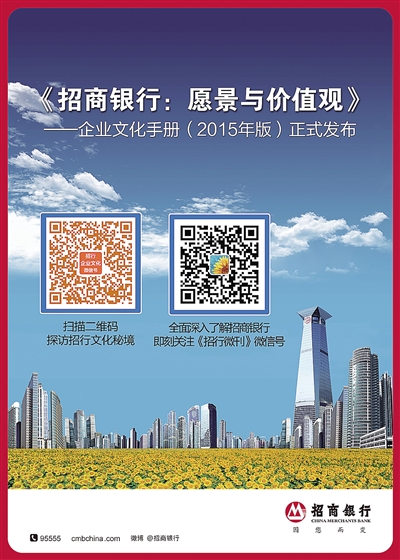 此次推出的新版企业文化手册共计15935字,编撰历时半年,先后经历了10余次大幅度修改,最终通过纸质版、PDF版和微信版三个主要渠道进行发布推广。在内容上,分别从招行的历史、愿景、目标、价值观、战略、员工这六个维度,系统阐述了三大问题:第一,招行从哪里来?第二,招行将走向何方?第三,作为团队中不可或缺的一员,该如何携手共进?新版手册确定了招行的愿景,即通过持续的服务升级,成为目标客户的首选银行,成为具有国际竞争力、中国最受尊敬的商业银行。通过认真总结28年来招行人身上所特有的精神,梳理出八条价值观:“因您而变”是招行的服务追求;创新是招行存在的最大理由;稳健经营是招行与生俱来的DNA;合规是企业和员工成长的基石;让员工做自己的主人;最值得尊敬的是专家;追求卓越是招行人的特质;化繁为简,严谨高效。正是对这些核心价值观的认同、践行与传承,招商银行在28年间实现了在市场竞争中的无数第一,成就了市场认同、客户满意的服务金字招牌,完成了从蛇口走向世界的飞跃式发展,创造了世人瞩目的“招银模式”。