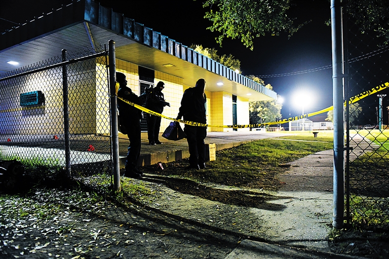 11月22日,在美国路易斯安那州新奥尔良市,警察在发生枪击案的公园操场收集证据。 据当地媒体报道,美国路易斯安那州新奥尔良市的一个公园22日晚发生枪击事件,当地警方说至少有10人受伤。 新华社/法新
