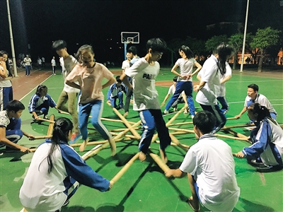保亭中学在初一班和高一班推广黎族竹竿舞,花5000多元,给初一和高一每个班购置了一副竹竿舞具,放手让学生自己编排动作,由老生指导新生跳。课后,晚修后,学生纷纷在校园里,舞动着竹竿,跳动着身体,健康快乐。