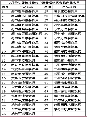 海南省食品药品监督管理局公告(2015年第11号)关于公布10月份集中消毒餐饮具抽检合格名单的公告