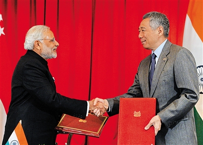 印度总理莫迪24日同新加坡总统陈庆炎、总理李显龙举行会谈。根据双方签署的联合声明,新印两国将在战略伙伴关系框架下,深化防务安全、贸易投资、航空运输与海事合作、建设智慧城市和城市规划等领域的合作。此外,两国政府相关机构和代表还签署了多项合作谅解备忘录。