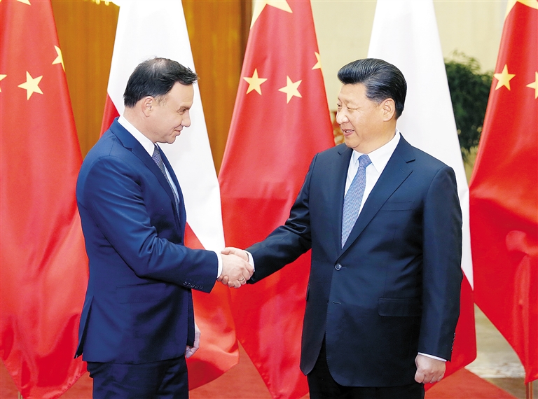 习近平欢迎杜达访华并出席第四次中国-中东欧国家领导人会晤。习近平指出,波兰是最早承认并同新中国建交的国家之一。2011年两国建立战略伙伴关系以来,双边各领域务实合作不断取得新进展。双方要进一步提高政治互信水平,继续保持高层交往,密切政府、立法机构、政党等交流合作,加强在国际事务中的沟通和协调。双方要夯实务实合作基础,加快“一带一路”倡议同波兰国家发展战略对接。中方鼓励有实力的中国企业继续赴波兰开拓市场,欢迎波兰企业来华发展。双方可进一步探讨以波兰为枢纽,规划打造新的物流线,建设辐射中东欧的物流中心。中方愿同波方拓展在金融、装备制造、环保、新能源、信息通讯技术、农业、科技、电子商务、基础设施建设等领域合作。双方要扩大人文交流,加强在旅游、教育、地方、体育等领域合作,增进两国人民相互了解。