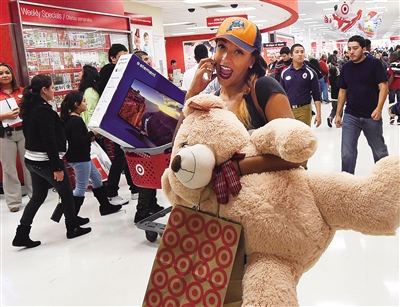 11月26日,在美国洛杉矶,一名顾客满载离开商场。 每年11月的第四个星期四是美国的感恩节,感恩节过后“黑色星期五”的打折促销将正式拉开美国年末假日购物季的帷幕,一直持续到圣诞和新年。 新华社/法新