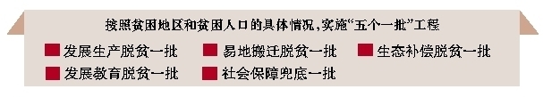 习近平强调,要解决好“怎么扶”的问题,按照贫困地区和贫困人口的具体情况,实施“五个一批”工程。一是发展生产脱贫一批,引导和支持所有有劳动能力的人依靠自己的双手开创美好明天,立足当地资源,实现就地脱贫。二是易地搬迁脱贫一批,贫困人口很难实现就地脱贫的要实施易地搬迁,按规划、分年度、有计划组织实施,确保搬得出、稳得住、能致富。三是生态补偿脱贫一批,加大贫困地区生态保护修复力度,增加重点生态功能区转移支付,扩大政策实施范围,让有劳动能力的贫困人口就地转成护林员等生态保护人员。四是发展教育脱贫一批,治贫先治愚,扶贫先扶智,国家教育经费要继续向贫困地区倾斜、向基础教育倾斜、向职业教育倾斜,帮助贫困地区改善办学条件,对农村贫困家庭幼儿特别是留守儿童给予特殊关爱。五是社会保障兜底一批,对贫困人口中完全或部分丧失劳动能力的人,由社会保障来兜底,统筹协调农村扶贫标准和农村低保标准,加大其他形式的社会救助力度。要加强医疗保险和医疗救助,新型农村合作医疗和大病保险政策要对贫困人口倾斜。要高度重视革命老区脱贫攻坚工作。