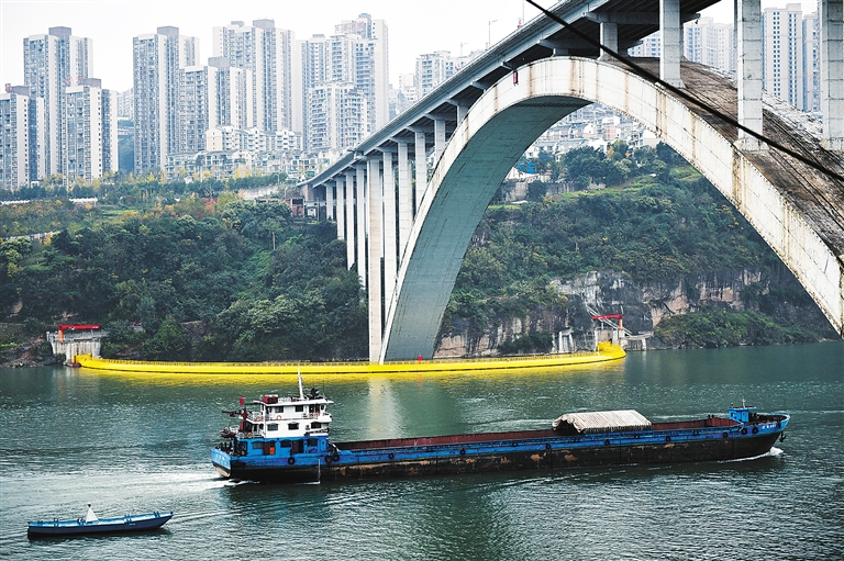 11月28日,船舶从建有防撞装置的重庆万州长江大桥下驶过。 近日,重庆万州长江大桥南桥头防撞工程完工并投入使用。据了解,依据三峡库区水域特点和航运条件,并结合峡谷山区桥梁特征,科研单位设计出“弧形水上升降式防撞装置”。该防撞装置引入船桥双重保护的理念,通过合理的结构外形和刚度设计,使船舶撞击后避免发生翻船、沉船的事故。 新华社发