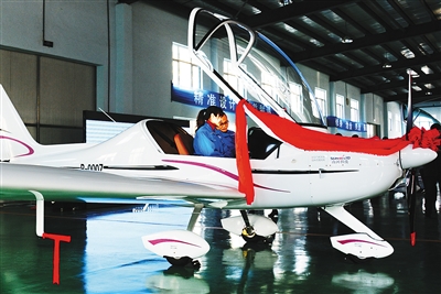 11月28日,两名工作人员在体验驾乘。 当日,吉林省山河通用航空有限公司组装的两架阿诺拉轻型运动飞机在吉林市经济技术开发区下线。该型飞机的机身、机翼采用碳纤维复合材料,空重345公斤,最大起飞重量600公斤,最大航程1200公里,最大升限4500米,最高航速270公里/小时。飞机使用97号汽油,油耗相当于1.5升排量的汽车,单价100万元左右,拥有中国民航总局颁发的轻型运动飞机适航证。 新华社记者 段续 摄