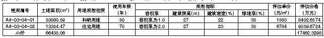 根据《中华人民共和国土地管理法》、《中华人民共和国城市房地产管理法》、《城镇土地使用权出让和转让暂行条例》、国土资源部《招标拍卖挂牌出让国有建设用地使用权规定》(第39号令)等有关规定,经三亚市人民政府批准,现将一宗国有建设用地使用权挂牌出让及有关事项公告如下:一、挂牌出让宗地基本情况和规划指标等要求:挂牌出让宗地位于海棠湾A4片区A4-03-04-01地块和A4片区A4-03-04-02地块,用地总面积66435.06m2(海南平面坐标系66407.70m2),用地四至及界址坐标详见用地勘测定界图。根据国土资源部《关于运用土地市场动态监测与监管系统加强土地供应和开发利用监管的通知》(国土资发〔2011〕26号)中有关住宅用地容积率不得小于或等于1的规定,同时根据市现代服务业产业园管理委员会出具的三服园管函〔2015〕256号文件,该宗地概况及规划指标等情况详见下表: