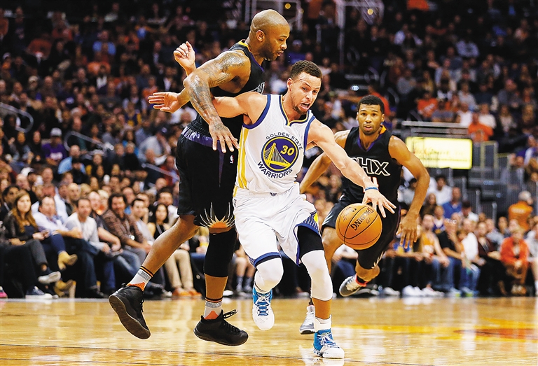 11月27日,在NBA常规赛中,勇士队客场以135比116战胜太阳队,取得17连胜。图为勇士队球员库里(右)在比赛中控球。 新华社发
