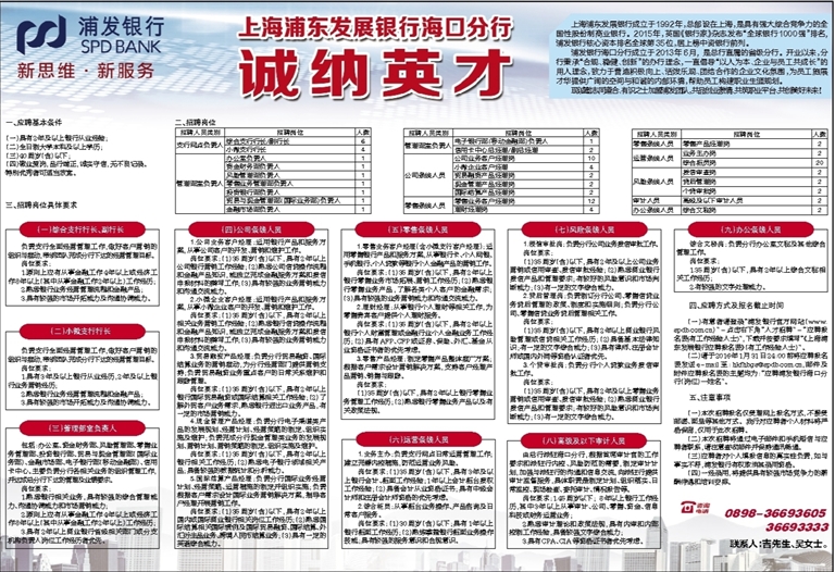 (二)请于2016年1月31日24:00前将应聘报名表发送e-mail至:hkfhbgs@spdb.com.cn,邮件及附件应聘报名表的主题均为:“应聘浦发银行海口分行(岗位)—姓名”。