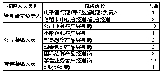 1.零售业务客户经理(含小微支行客户经理):运用零售银行产品和服务方案,从事银行卡、个人网银、手机银行、个人贷款等银行个人金融产品的营销工作。