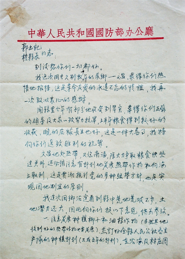张云逸身居北京,心中时刻牵挂着山海那头的故乡,与时任文昌县委书记的郭春、时任文昌县长杨立英的多封通信里,他为家乡脱贫致富出谋划策。