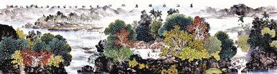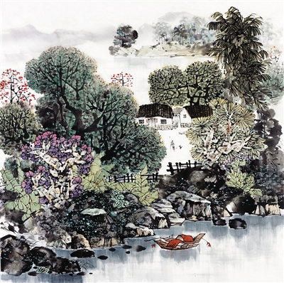 用他的话来说,传统国画是“九分笔墨一分彩”,而他的国画却是“七分笔墨三分彩”,甚至能达到“六分笔墨四分彩”。但是,那些冷暖色彩无论如何活泼跳跃,总能在不掩盖墨韵、不伤害墨色的前提下,呈现交相呼应、浓淡相宜的视觉效果,让他的画作不失国画本魂。