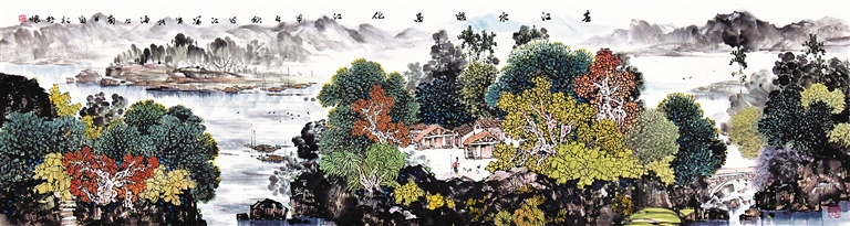 “比如,黎雄才老师对水墨的处理十分得当,作品呈现的墨韵气魄宏大;关山月老师对颜色和水墨的辨证运用令人叹服,他创作的《江山如此多娇》《绿色长城》等国画杰作流芳千古。他罕有地在国画中用色彩的递进表现了‘光’的作用,直接回答了笔墨与色彩是否能够在国画中共生的辩题。”不知多少个日夜,阮江华一遍又一遍对着这些国画大师的作品沉思,观察的焦点细致到一根线条、一抹淡墨,反复琢磨、加以扬弃,渴望能够集百家之长。