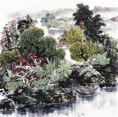 但是,自小生长于“四季和风四季花”的海南,阮江华生命里的颜色鲜活而生动。渐渐地,国画设色的相对单调已无法满足他对海南山水的表现。幸而,海南大学美术专业的学习经历,让他从西画的丰富色彩上又汲取到更多灵感,于是,他笔下的国画最终形成了水墨与色彩辩证统一、色彩为水墨服务并且设色大胆恣意的画风。