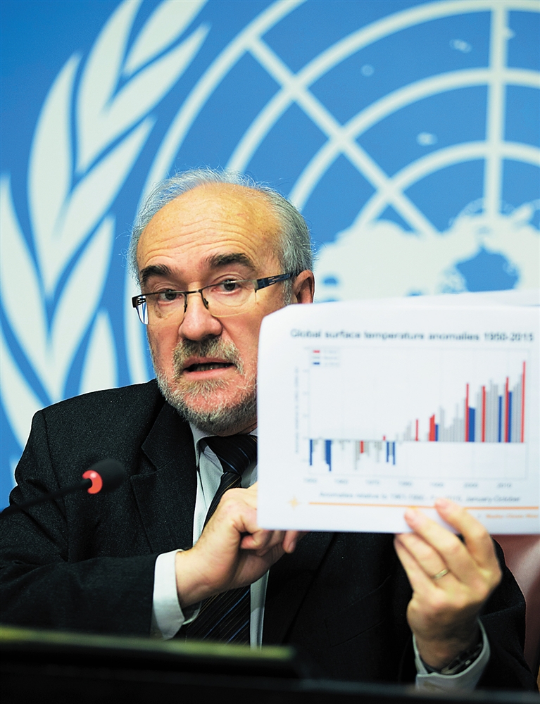 11月25日,世界气象组织总干事米歇尔·雅罗在瑞士日内瓦出席记者会并展示全球气温变化的年度数据图。 根据世界气象组织当日发布的最新报告,受强厄尔尼诺和人类活动引发的全球变暖影响,2015年全球平均地表温度可能创下自有气象记录以来的最高值。新华社发
