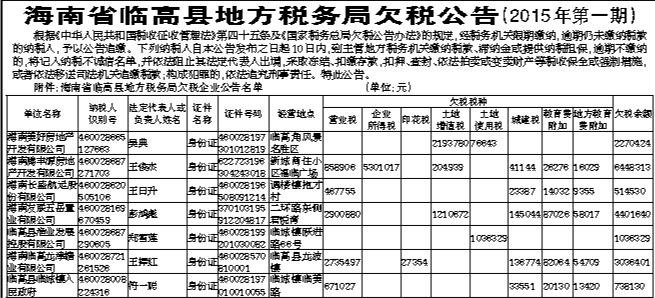 海南省临高县地方税务局欠税公告(2015年第一期)
