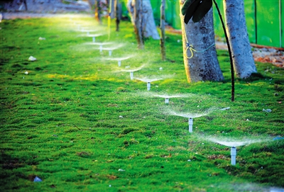 图为三沙市永兴岛上,基础道路建设两旁的自动化浇灌绿化带。