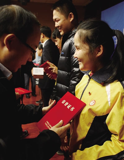 11月30日,嘉宾为全国盲人百科知识竞赛决赛获奖选手颁奖。 当日,由中国盲文出版社、中国盲文图书馆主办的首届全国盲人百科知识竞赛在北京中国盲文图书馆举行决赛,120多名盲人选手参加。 新华社发