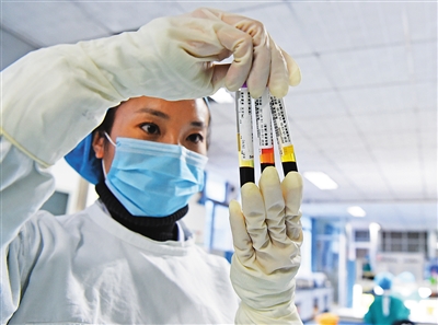 12月1日,第三军医大学新桥医院国家艾滋病确诊实验室内,医生查看检血样测试管。 当日是第28个“世界艾滋病日”,为宣传艾滋病相关知识,位于重庆的第三军医大学新桥医院国家艾滋病确诊实验室、输血科、门诊部共同举办“行动起来,向‘零’艾滋迈进”主题活动。