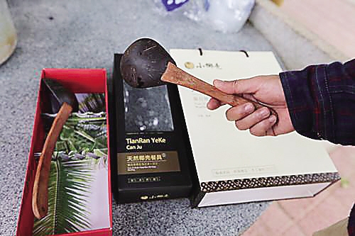 在位于万宁的工厂内,“小椰壳”的总经理符冬波对旅游周刊记者展示并介绍了椰壳餐具:餐具都以椰壳为勺体,海南荔枝木为勺把,全套包括了水勺、汤勺、饭勺、调羹、锅铲、漏勺、粥勺等用具,结构简单,经久耐用,无毒、无污染、使用安全,同时提高了椰子壳的利用率。