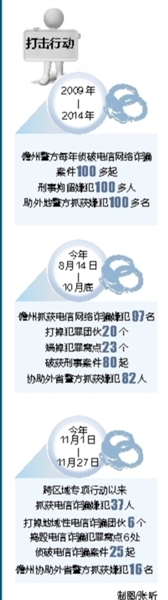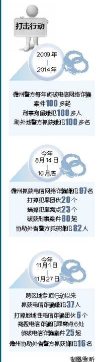 据不完全统计,2009年至2014年,儋州警方每年侦破电信网络诈骗案件100多起,刑事拘留犯罪嫌疑人100多人,另协助外地警方抓获犯罪嫌疑人100多名。从今年8月14日至10月底,儋州抓获电信网络诈骗犯罪嫌疑人97名,打掉犯罪团伙20个,端掉犯罪窝点23个,破获刑事案件80起,缴获赃款20多万元,协助外省警方抓获犯罪嫌疑人82人。而在11月1日开始的跨区域专项行动以来,截至11月27日,共抓获电信诈骗犯罪嫌疑人37人,打掉地域性电信诈骗职业犯罪团伙6个,捣毁电信诈骗犯罪窝点6处,侦破电信诈骗案件25起。儋州还协助外省公安机关抓获犯罪嫌疑人16名,带破一批相关案件。