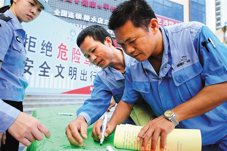 12月2日是第四个“全国交通安全日”,主题为“拒绝危险驾驶,安全文明出行”。当日,陵水多部门联合在海韵广场开展警用装备展示、发放宣传品、主体展板展示、签名承诺等主题活动。并在红绿灯路口开展文明劝导教育,倡导市民增强交通安全意识、文明出行。图为群众签名承诺“拒绝危险驾驶,安全文明出行”。