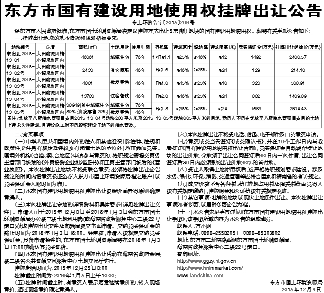 东方市国有建设用地使用权挂牌出让公告