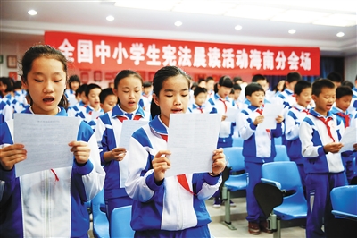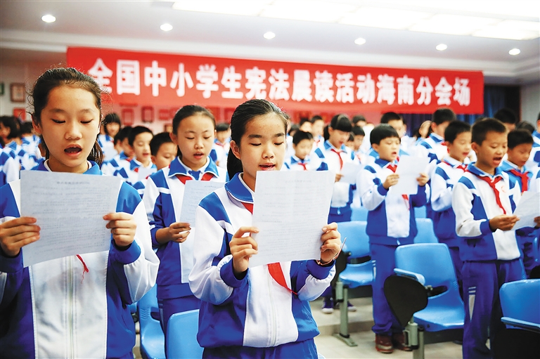 12月4日上午,海口市第25小海甸分校三楼阶梯教室,全国中小学国家宪法晨读活动海南分会场在此举行,两百余名师生一起朗读宪法条文。此次活动教育部与我省视频连线同步进行。