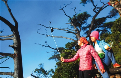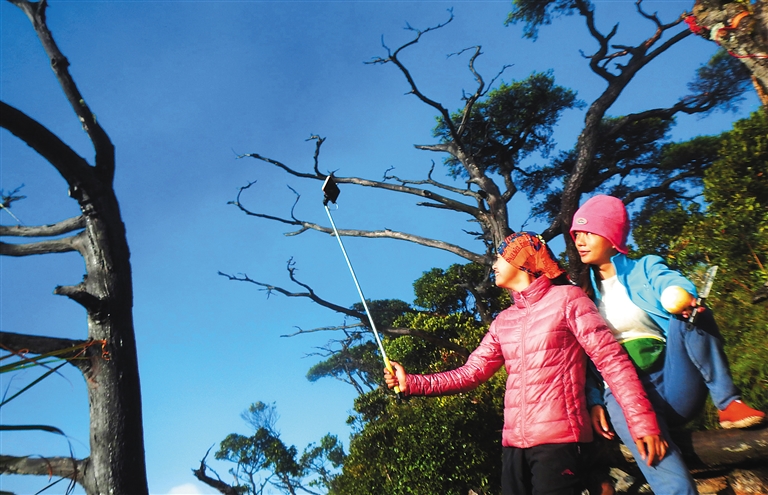 12月5日,前来攀登五指山的游客在美景中兴奋自拍。当天,水满乡迎来了十余辆满载游客的大巴,风情小镇上处处涌动着岛内外游客身影。