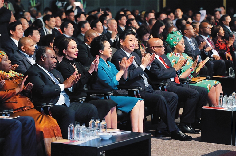 晚8时许,习近平夫妇同南非总统祖马夫妇及出席中非合作论坛约翰内斯堡峰会的各国领导人一起步入演出会场时,全场近千名观众起立,热烈鼓掌。这台名为《中非时刻》的晚会,由来自中国和非洲国家的近200名演员联袂奉献。