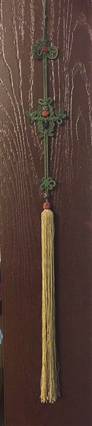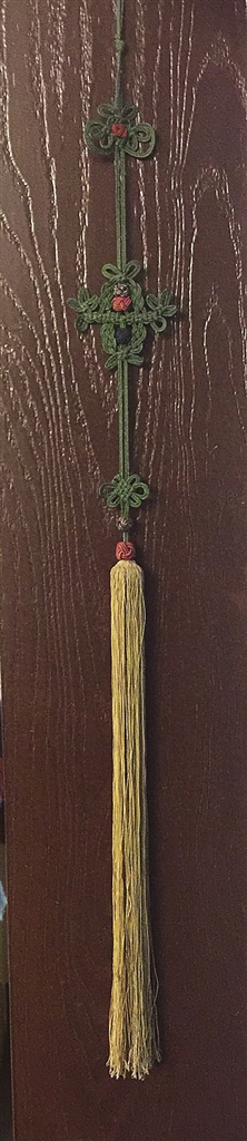 流苏之美,美的简单纯真,绝不自矜自傲,孤芳自赏,一如小鸟依人,虽甘为陪衬,而无丝毫阿谀气,又似空谷幽兰,摇曳出无限风姿,贵在一一服气、谐合于各个历史年代的艺术载体。流苏以蚕丝为本,妙手编织,绦丝飘拂,上联缠头,接丝绳,绾成“中国结”,上留挂绳。绦丝多为单穗或双穗,亦有多穗,帷幄之上常见横排,联缀数十上百流苏,适于旧时喜寿帐子。而玉用、剑用、如意用、笛箫之所用缀之流苏,可单穗至多不过双穗,过则入俗流。流苏缀之于悬磬下端,须左右各一,对称系挂,好事成双。