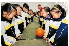 12月8日,河北省邢台市桥东区龙泉小学的学生在室内练习传球。 当日,河北再遭重污染天气,邢台市教育系统启动《重污染天气应急预案》,中小学校取消室外活动,各学校开展运动量较低的室内体育锻炼。 新华社发(陈雷 摄)