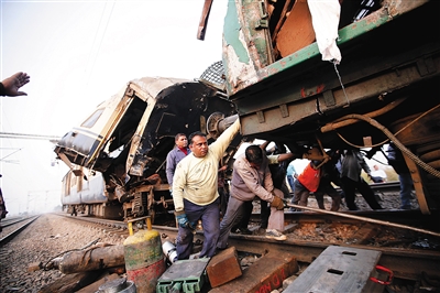 12月8日,在印度哈里亚纳,救援人员清理事故现场。 当日,两列客运火车在印度北部哈里亚纳相撞,至少1人在事故中丧生,另有数十人受伤。 新华社/路透