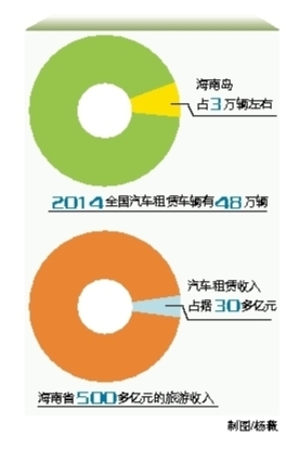 据不完全统计,2014全国汽车租赁车辆有48万辆,海南岛占3万辆左右;海南省500多亿元的旅游收入里,汽车租赁收入占据30多亿元。